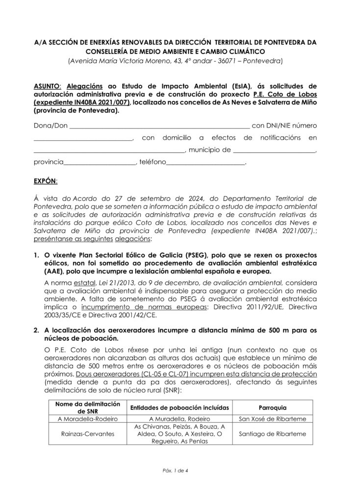 Modelo de Alegacións contra o Parque Eólico Coto dos Lobos dispoñible para a veciñanza
