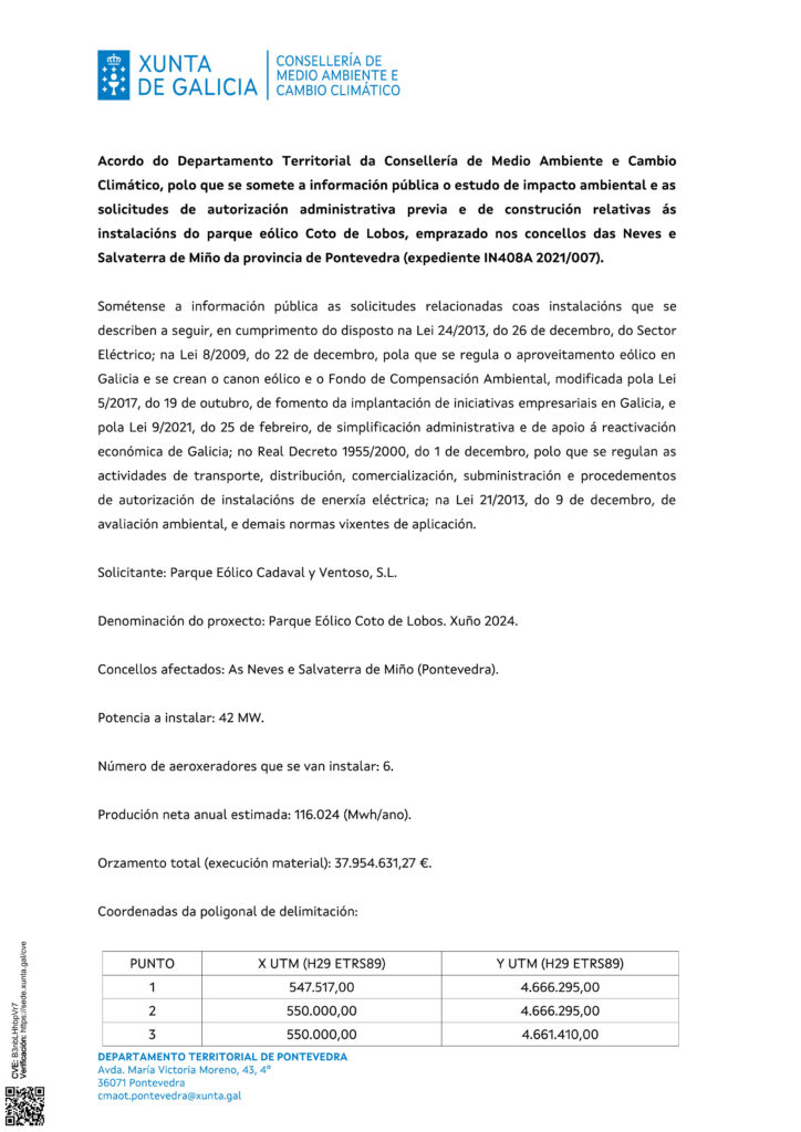 Modelo de Alegacións contra o Parque Eólico Coto dos Lobos dispoñible para a veciñanza