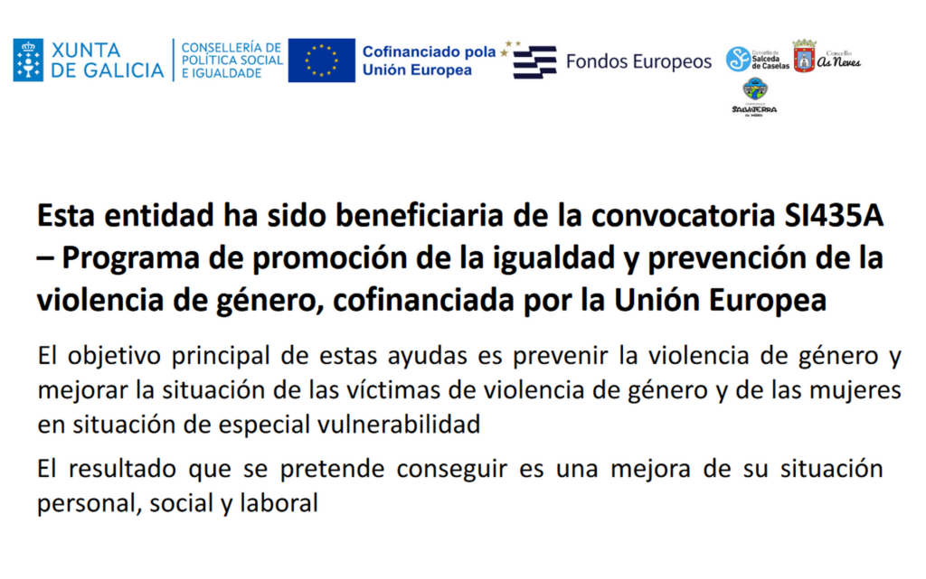 Os Concellos de Salvaterra de Miño, Salceda de Caselas e As Neves, a través do programa de xestión compartida Xuntas, foron beneficiarios das axudas da convocatoria SI435A, Programa de Promoción da Igualdade e Prevención da Violencia de Xénero, da Consellería de Política Social e Igualdade da Xunta de Galicia, cofinanciado pola Unión Europea.